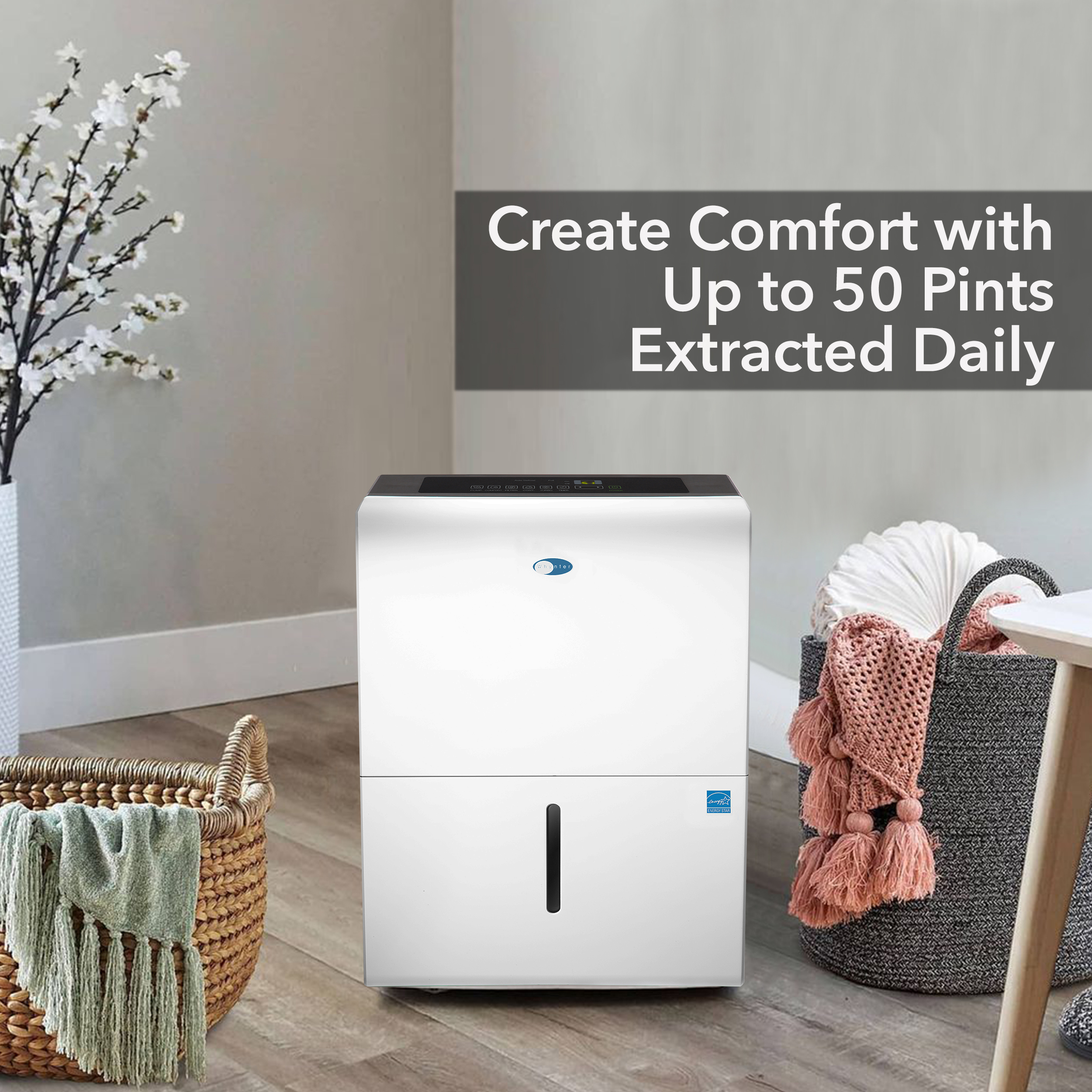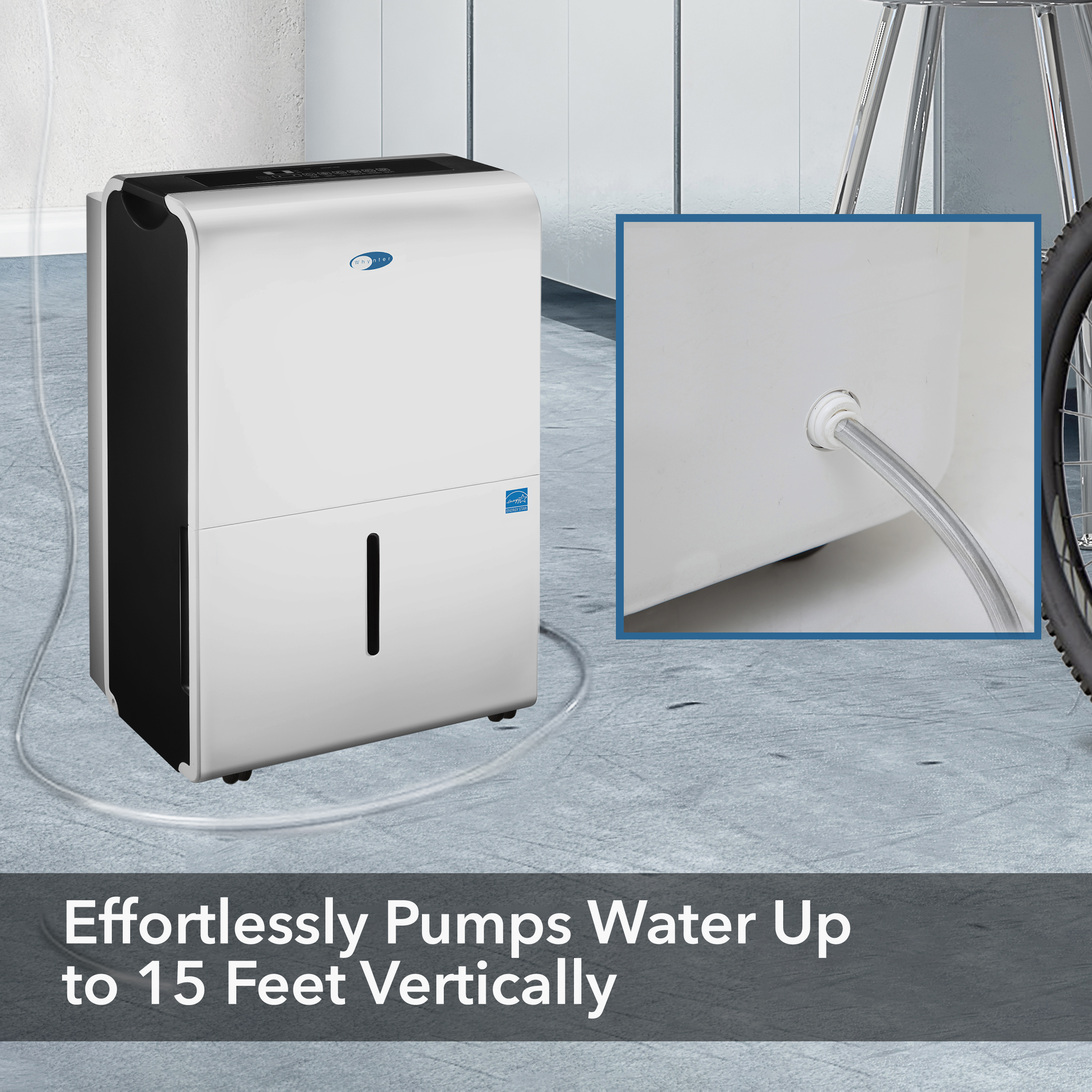 The stylish and powerful Whynter RPD-506EWP Energy Star 50 Pint Portable Dehumidifier with Built-in Pump is a high-capacity unit with an impressive capability of removing up to 50 pints of moisture from the air per day. Featuring an internal condensate pump, this unit is specifically designed for high-volume usage without having to worry about the interrupted operation.