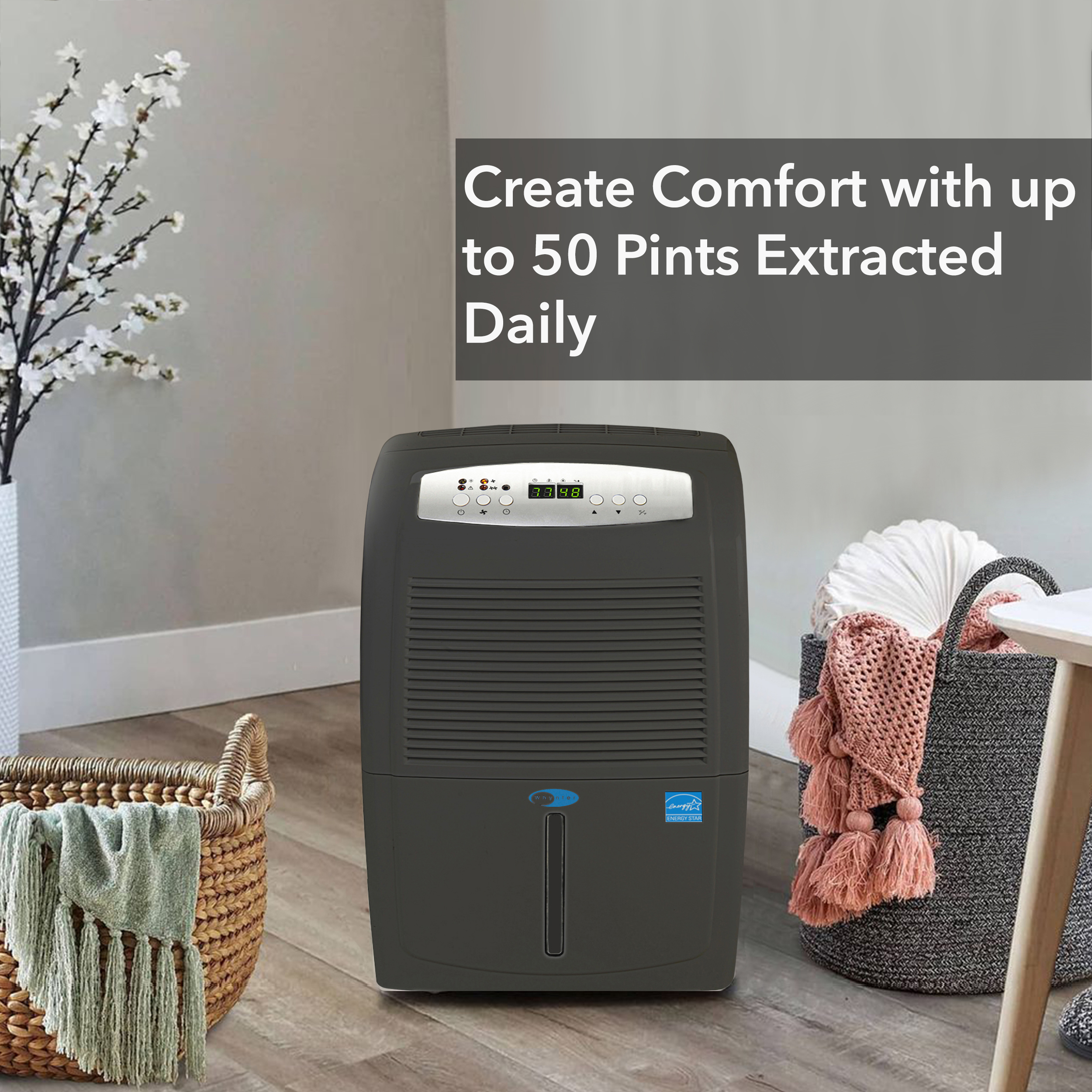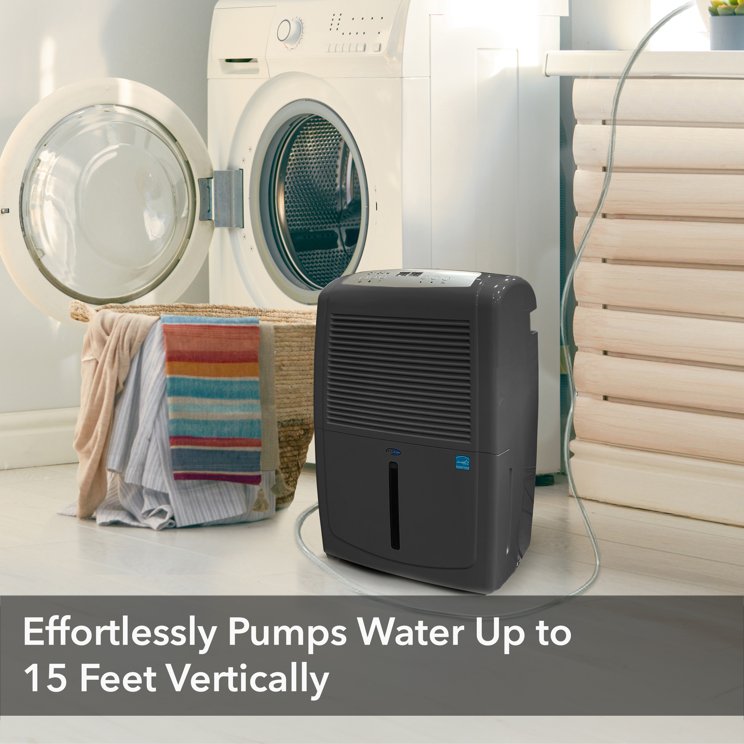 The stylish and powerful Whynter RPD-561EGP Energy Star 50 Pint Portable Dehumidifier with Built-in Pump is a high capacity unit with an impressive capability of removing up to 50 pints of moisture from the air per day. Featuring an internal condensate pump, this unit is specifically designed for high volume usage without having to worry about interrupted operation.