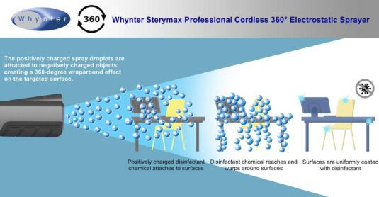 The Whynter Sterymax 360 Professional Electrostatic Sprayer places a positive charge on the liquid twice, once before entering the nozzle, and again at the nozzle, resulting in the maximum volume of liquid being charged and sprayed at surfaces (most surfaces are either negative or neutral) allowing for a complete 360 degrees wraparound coverage.